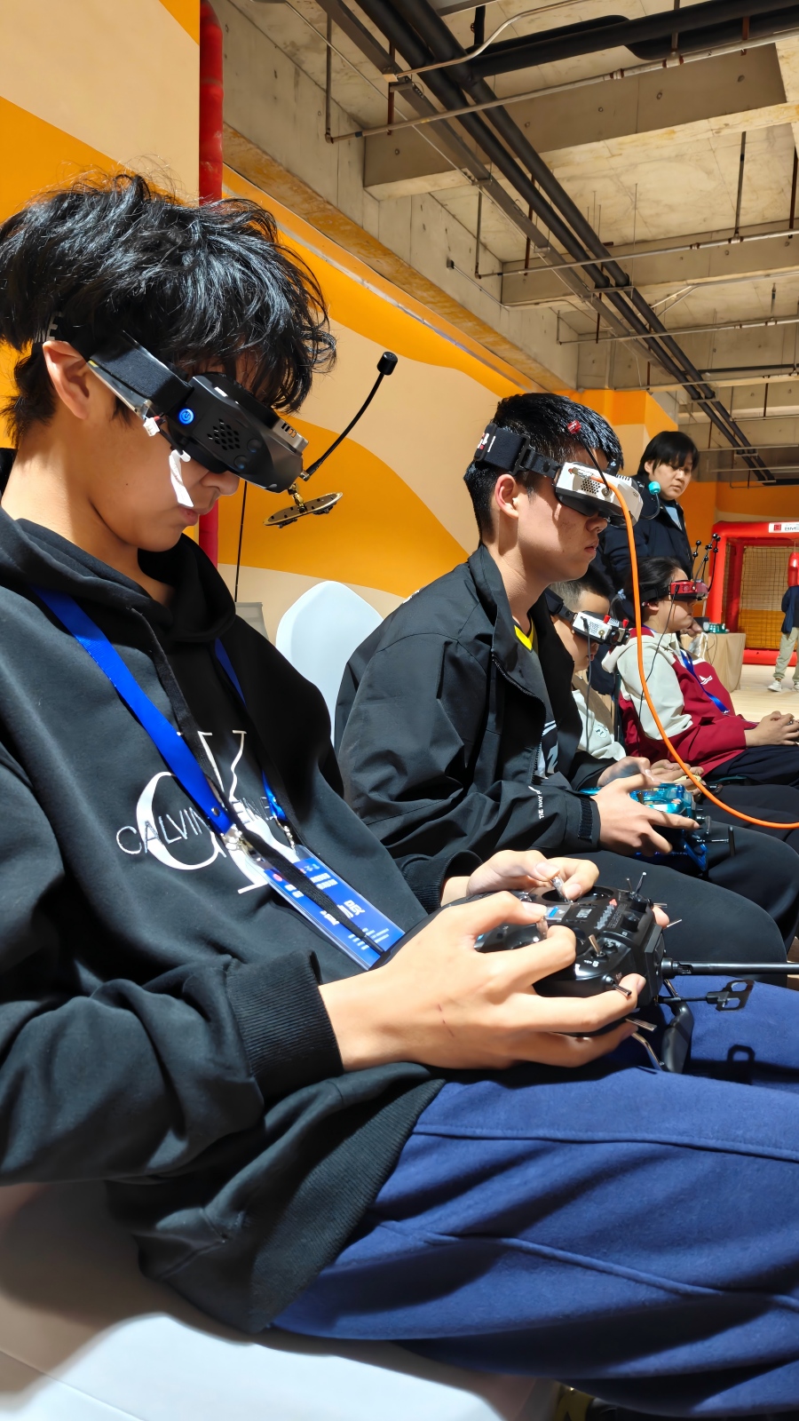 首站比赛现场,两大项目各具看点,充分展现了科技体育的技术含量。多旋翼机足球项目在封闭式球形防护笼内展开激烈角逐。红蓝两队操控多旋翼机,在空中展开攻防对抗,争夺将“球”送入对方球门的机会。该项目融合了团队协作、战术策略与精准操控,要求选手不仅熟练掌握多旋翼机的悬停、急转、碰撞规避等技巧,还要在高速对抗中保持冷静判断,同时与队友形成有效配合。